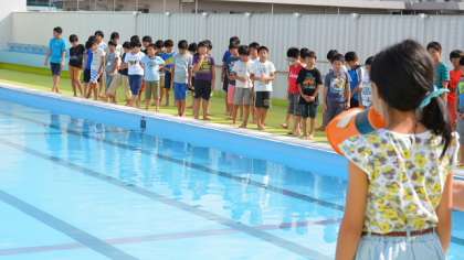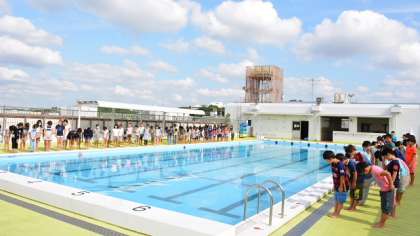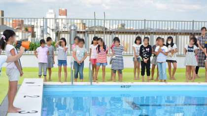 15日(火)1校時、4年生がプール納めのセレモニーをプールサイドで行いました。水泳指導や検定は先日終わっていたので、今日はセレモニーだけとなりました。クラス代表が今シーズンの成果と抱負を語り、お世話になったプールに向かってあいさつをして終了しました。事故もなく無事が何よりでした。