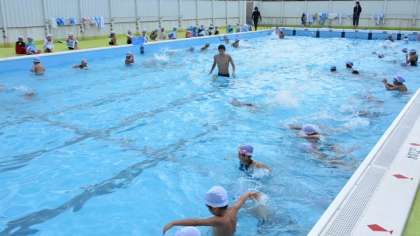 15日(火)3・4校時、1年生が今シーズン最後のプール指導を行い、最後にプール納めをしました。空は秋空、気温も低めでしたが、頑張った1年生でした。最後にお楽しみの「石拾い」(樹脂製のボールを水中から拾い上げる)をして終了です。ちょっと寒かったようですが、元気いっぱいの1年生です。