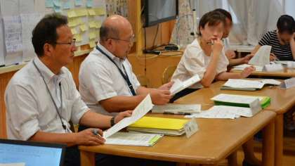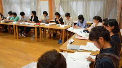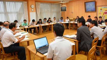 実技研修の後、場所をランチルームに移して研究協議会を行いました。この日は講師の先生と、町田市から授業を見にいらした先生も交え、活発な議論が行われました。協議の後、講師の先生からの指導・講評をいただき、協議会終了後も、さらに校長室で講師の先生から遅くまで質問やアドバイスをいただきました。