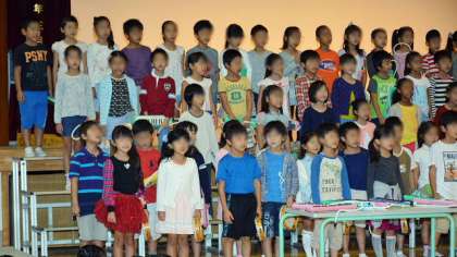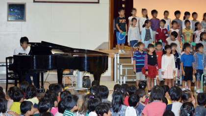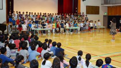 17日(木)、体育館で音楽朝会を行いました。今日は2年生の発表です。昨夜から降り続ける雨の中、保護者・家族の皆さんも続々と駆けつけ、子どもたちを見守る中、2年生の歌と演奏が始まりました。