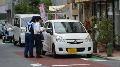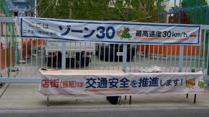 秋の交通安全運動が行われています。24日は学校の西門前に地域の方が集まり、「ゾーン30」のキャンペーンをしました。このページでもたびたび紹介していますが、「ゾーン30」というのは、地域を丸ごと制限速度を時速3キロメートルに指定していることです。この日は、玉川警察署の方にも来ていただき、通りかかった車の運転手さんや歩行者の皆さんに紹介パンフレットやティッシュペーパーを配り、協力を呼びかけました。