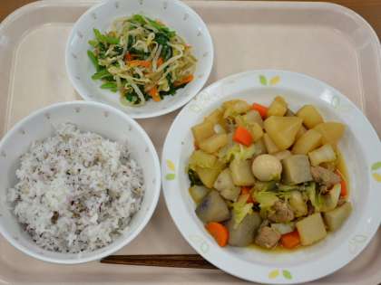 ゆかりごはん 牛乳 豚肉と大根のうま煮 ごまあえ