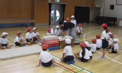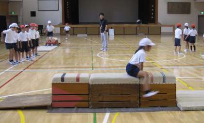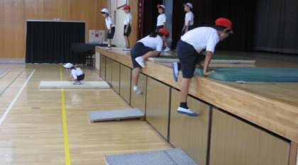 「跳び箱を使った運動遊び」の学習をしています。工夫した場で取り組むことで、跳び箱運動につながる運動感覚を養っています。『助走から強く両足で踏み切る』『腕でしっかり自分の体を支える』『着地でぴったととまる』などを身につけていきます。2年生の子どもたちの挑戦意欲はすばらしく、1時間で技能が大きく向上しました。楽しみながら、思い切り体を動かしているところがすてきです。