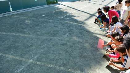 3年生が校庭で、太陽の光を鏡で反射させて、投てき板にあてる活動をしていました。理科の学習です。なんとなくわかっている現象ですが、改めてやってみると、とても面白く、新たな発見があります。それを、事物の性質として整理していくのが、理科の学習です。夢中になって活動していた子どもたちです。