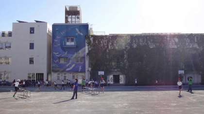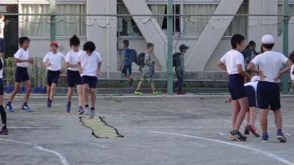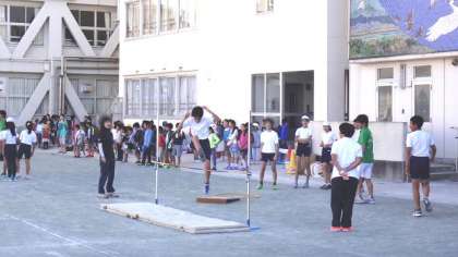 種目は走り幅跳び、走り高跳び、50メートルハードル走、100メートル走です。朝日をあびてがんばる6年生です。これから毎朝練習があります。