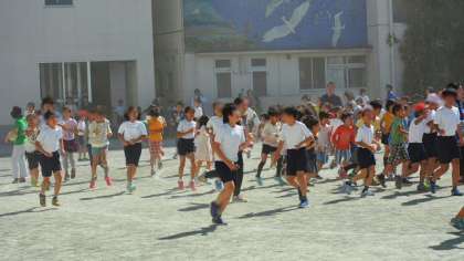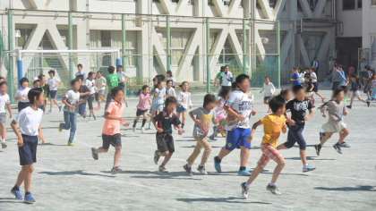 8日(木)の中休みの最後の5分間、全校児童が運動タイムに取り組みました。この日は乾いた強風がふき、校庭は砂ぼこりがまっていましたが、その中でも一生懸命走ったり、縄跳びに励む子どもたちです。