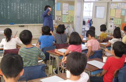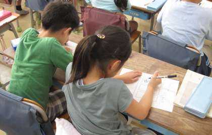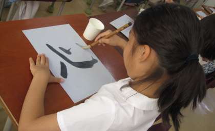 初めて筆を使って文字を書きます。筆で書く前に、いつも使っている鉛筆やペンで、知っている漢字を3つ書きました。書く前にみんなで注意するところを確認しました。筆に水をつけて水黒板に書くときは、緊張感が高まりました。「書きたい!」という気持ちで書いた字は、とても上手でした。