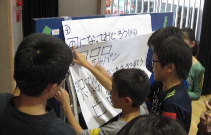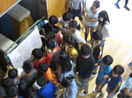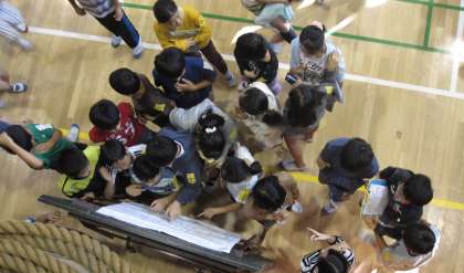 活動は名付けて「リアル脱出ゲーム」。瀬田小、二子小合同のグループをつくって、謎を解いたり、ミッションをこなしたりしながらゴール地点に向かいます。体育館から脱出するためには、謎を解き、合言葉を考えなければなりません。