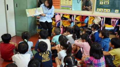 子どもたちは読み聞かせの時間をいつも楽しみにしています。保護者の皆さんも、それに応えるように勉強会を行ったり情報交換を行ったりして、子どもたちの興味関心をひくような絵本を選び、読み方、見せ方の工夫をしてくださっています。