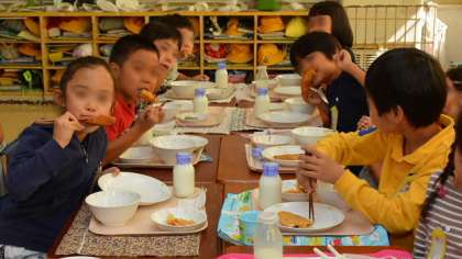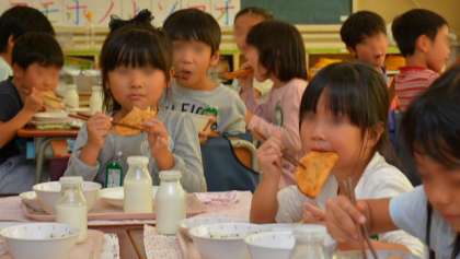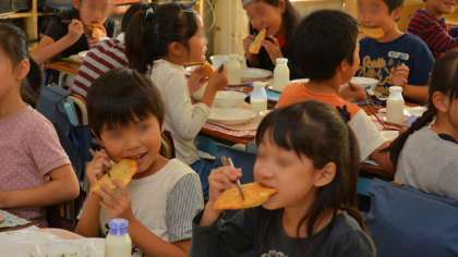 9日(金)の給食メニューはジャンボ餃子。かぶりつくのが大変なくらいボリュームのある大きな揚げ餃子です。みんなおいしそうに食べていました。