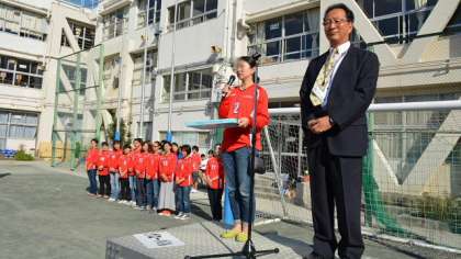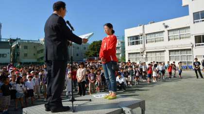 今朝の朝会、その後は、昨日のバレーボール大会で見事優勝したPTAバレーボール部の皆さんにおいでいただいて、子どもたちの前で表彰をしました。子どもたちだけでなく、保護者の皆さんも練習に励んで、成果を残していることがうれしいですね。