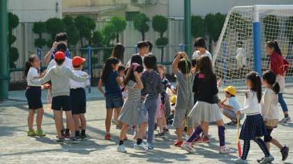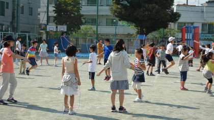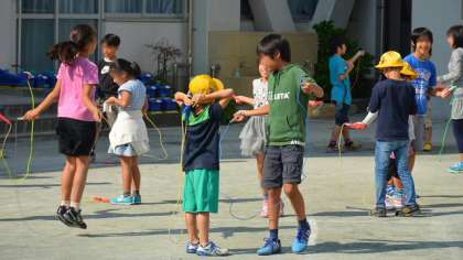 13日(火)の昼休み時間は「なかよしタイム」で、グループごとに縄跳びをしました。校庭を割り当てられた班は、普通の縄跳びで、高学年が上手に跳ぶのを見て、低学年がはりきっていました。