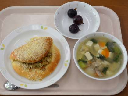 ピロシキ 牛乳 豆腐と青菜のスープ 巨峰