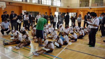 整理運動の後、自分なりの振り返りを記入し、用具を片付けて授業終了です。区内からたくさんの教員が集まり、この授業を参観し、授業後はランチルームで協議会を行いました。本校の日常的な取り組みも紹介しました。われわれにとっても、事項の取り組みを振り返り、授業を向上させるためのよい機会となりました。何よりも、子どもたちが最後まで集中してしかも意欲的に活動していたことをうれしく思いました。