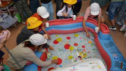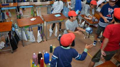 3年2組は「ゲームセンター」。スーパーボールすくいと、ペットボトルを利用したピンで遊ぶボーリングで、みんなを楽しませてくれました。