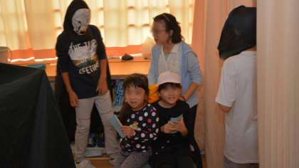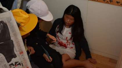 6年1組は「インディやしき」。ようするにお化け屋敷なのですが、シチュエーションを設定して怖がらせていました。メイクや衣装が本格的で怖いですね。