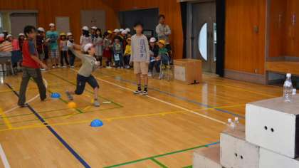 体育館では6年生2クラスが思いっきり体を動かすゲームを設定してくれました。6年2組は「ミニラスベガス」。ボールを投げたり、蹴ったり、転がしたりして、的当てをしました。