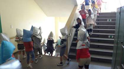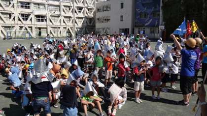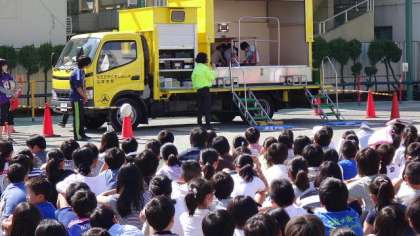 19日の避難訓練は、大地震発生の想定で、教室で安全確保をした後、校庭に避難しました。防災ずきんをかぶり「お・か・し・も」の約束を守りみんなで避難します。今日は、ちょっとおしゃべりする子がいたり、クラスの列からはぐれたりする子がいたのが残念です。次回は、今日よりもさらに真剣にできるようにしてほしいと思います。避難訓練終了後、4年生は起震車による震度7の地震の揺れを体験しました。想像以上の揺れに、びっくりしている子が多かったようです。