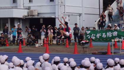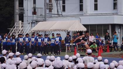 競技を始める前に、大学生トップクラスの選手による走り幅跳び、ハードル走、バトンタッチの見本演技を見学しました。さすがの動きに、みんなからため息や歓声がわき起こりました。