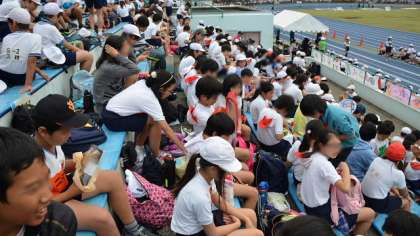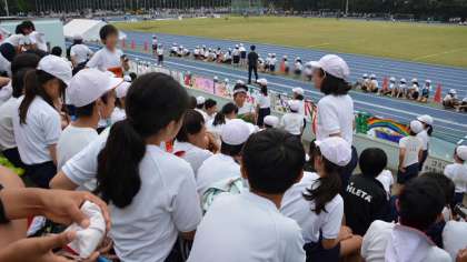 スタンドからはみんなの声援がとびます。男子は早めの昼食で、出番を待ちます。