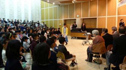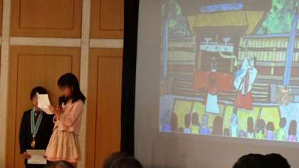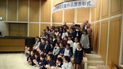 会場の世田谷美術館には、たくさんの方が訪れ、表彰式を見守り祝福の拍手をいただきました。「世田谷区長賞」の4年生は、作品がスクリーンに大写しされ、作品作成のいきさつや制作について、また受賞の感想などを皆さんの前で発表しました。最後に受賞者全員で記念撮影です。