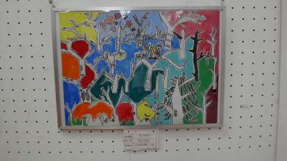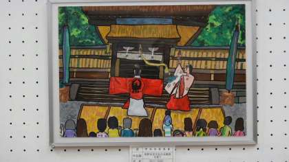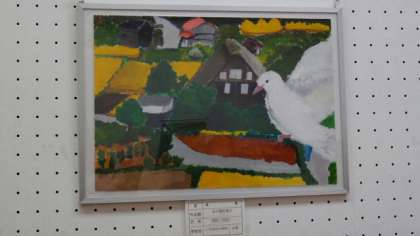 受賞した作品です。上から「世田谷区長賞」4年児童「熊野本社の本殿祭を見て」、「金賞」6年児童「白川郷を飛ぶ」、「入選」1年児童「めいろのもり」です。