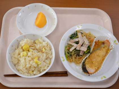 栗ごはん 牛乳 魚のねぎマヨ焼き 小松菜サラダ 柿
