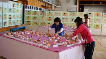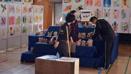 明日6日(金)から展覧会(明日は児童鑑賞日)が始まります。放課後の会場では、各学年の教員が、展示物の飾りつけと最後の確認をしました。