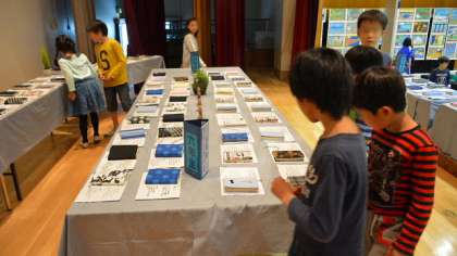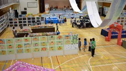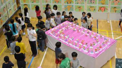 会場は、子どもたちの創意あふれる作品が所狭しと並べられ、華やかな雰囲気です。1年生から4年生までは図工の平面作品と立体作品が、5・6年生はそれに加えて、家庭科の作品が並んでいます。