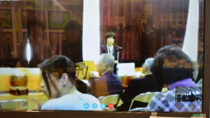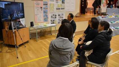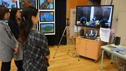 太平洋戦争末期、本校が「二子玉川国民学校」だった時代に、空襲から子どもたちを守るために、集団疎開が行われたことはご存知だと思いますが、本校からも長野県中川村に集団疎開した方々がいらっしゃいます。戦後70年の節目に、疎開先の中川村との交流が、一昨年から始まっています。今日は中川村で疎開のメモリアルとしての記念碑が建立され、その記念式典が、現地の「中川西小学校」で行われました。その様子を、今日はインターネット回線を使って展覧会会場の一角で中継しました。