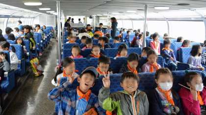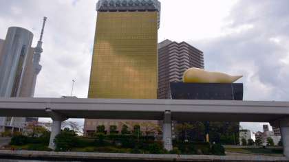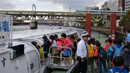 浅草の見学を無事終えて、次は浅草二天門の桟橋から、貸し切りの水上バスに乗って、隅田川を下り、お台場まで行きます。わくわくしている子どもたちです。出発してすぐ、有名な金色のビルとスカイツリーが見えました。
