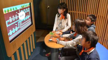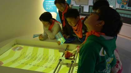 共催後の見学先、「水の科学館」です。4年生は学校で「水道キャラバン」と「下水道キャラバン」の出前授業を受けていますから、生活に使う水道については詳しいのです。実験コーナーや体験コーナーを回りながら、グループ楽しく学習できました。