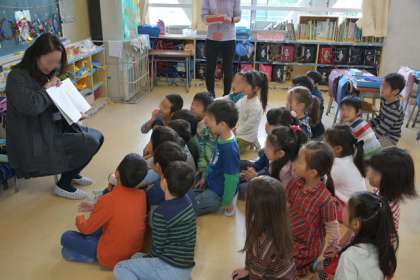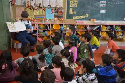 13日(金)朝、1年生の各学級での読み聞かせのようすです。保護者の方が読んでくださっています。子どもたちが食い入るように絵本を見つめています。