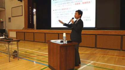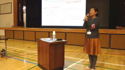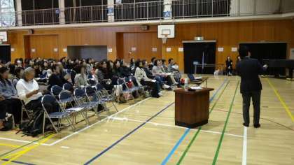 14日は土曜授業日で、子どもたちは4時間授業でした。そんな中、体育館では、PTAの「地区班保護者会」が行われました。前半は、大学で交通システム工学を研究している先生を講師としてお呼びして、交通安全について子供の行動心理学的な立場からお話をしていただきました。先生には、実は、毎年子どもたちが参加する、夏の交通安全ワークショップでもお世話になっています。研究成果をもとに、交通安全指導には何が大切かを、わかりやすく解説していただき、大変参考になりました。会場には未就学の保護者の方も含めて100人以上の方がいらっしゃって、熱心に耳を傾けました。