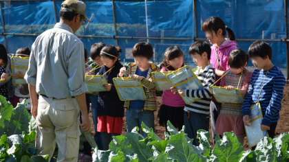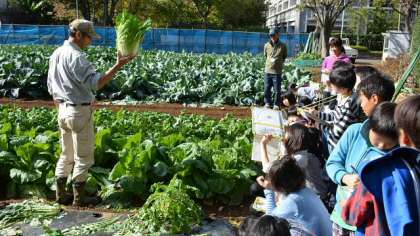 今日は雨上がりでしっとりとしめった畑でいきいきと育っている野菜を間近で見ることができ、そのみずみずしさに子どもたちは感動していました。農業の苦労話や、お客さんが喜んで買ってくれることが幸せだというようなお話も聞かせていただき、本当によい校外学習となりました。農作業の合間の貴重な時間をさいて説明や実演をしていただき、本当にありがとうございました。