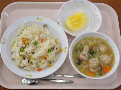 鶏ごぼうピラフ 牛乳 白菜と肉団子のスープ りんご