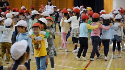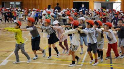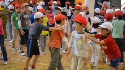 交流の最後は「じゃんけん列車」です。みんなでフリーに動いてじゃんけんをして、負けた方が勝ったほうの後ろにつながります。2校の児童が入り交じって、倍々でどんどん列が長くなっていきました。最後にみんなであいさつし合って終了。学区としては進学先が瀬田中学校という2校の小学校の子ども同士が、より知り合う機会をもつことを目的とした「多摩川の学び舎」の活動です。