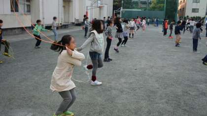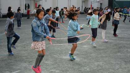 後半は音楽に合わせて、いろいろな跳び方に挑戦です。前跳び、後ろ跳び、交差跳び、後ろ交差跳び、後ろあや跳び、二重跳び・・・最後は今日練習した側振跳びです。家でも手軽にできるなわ跳びです。楽しんで体を動かし、体力向上と健康増進に役立ててください。