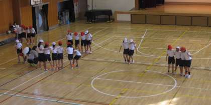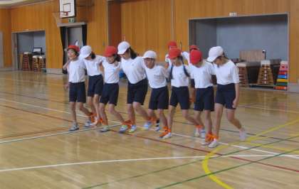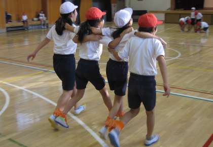 ソーシャルスキル(対人関係や集団行動を上手に営んでいくための技能)を高める実践です。子どもたちは体を動かしながらコミュニケーションをしています。声をかけ合い気持ちを合わせて取り組んでいる内に、二人三脚から発展して人数がどんどん増えていきました。男女仲良く取り組んでいる姿が印象的でした。