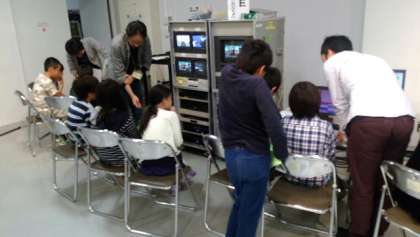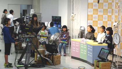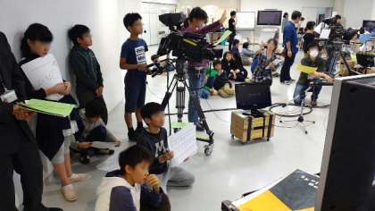 さあいよいよ番組作りの体験です。学年がAグループとBグループに分かれて、前半はAグループが番組作りです。前もって決めてきた音声やビデオ、ディレクターやカメラマンなどの役を、専門スタッフの指導で行っていきます。何度も繰り返し練習しているうちに、どんどん上手になっていくのがわかります。