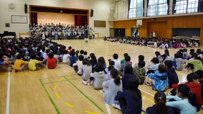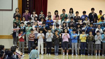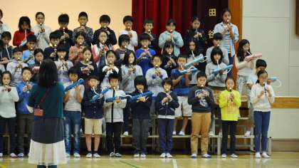 合唱の次は合奏です。卒業式に合奏する予定の「生命のいぶき」です。美しい音色が響き、聞いている子どもたちもうっとりしていました。卒業式の時は、ほかの楽器も加えて演奏します。