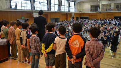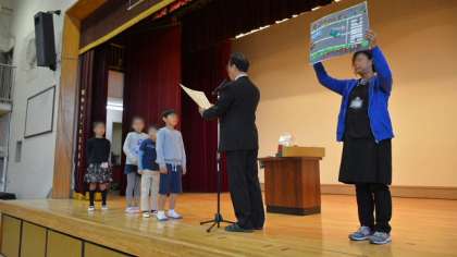 朝会では表彰もしました。最初はサッカー部3年生が大会で優勝の快挙です。出場した子どもたちが、金メダルを胸に、誇らしげにステージに立ちました。次は夏休みの選択課題として応募した交通安全ポスターで金・銀・銅賞に入賞した子どもたちの表彰です。図工専科教諭が、作品もみんなに見せながら表彰しました。最近子どもたちをこうやって表彰できる機会が多く、とてもうれしく思っています。