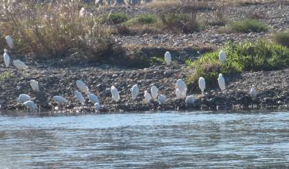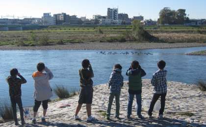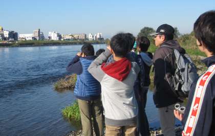 対岸の川崎市側の川原には、コサギ、カワウなどが大群でいました。また、じっと動かずに堂々としているアオサギも見ることができました。観察できた鳥の種類を数えていくと、14種類も見ることができました。城南環境学習支援グループの7名のインストラクターの方がグループごとに詳しく解説してくださいました。