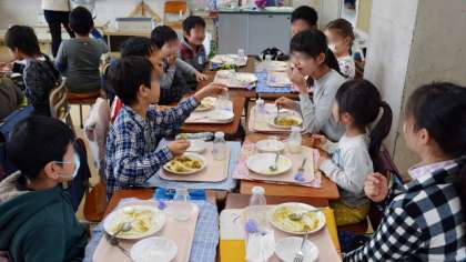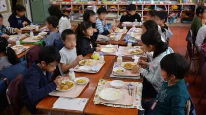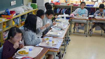 8日(火)給食は、1年生から6年生までの児童で編成する「なかよし班」で一緒に食べる、なかよし班給食です。4時間目が終わって、それぞれの班の教室に移動し、みんなで楽しくお話しながら給食を食べました。