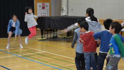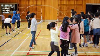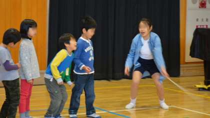体育館では長なわ跳びです。高学年が跳びやすいように声をかけて、なわをまわしていました。順番待ちしている子も、声をかけ、うまく跳べると一緒に喜んでいるようすがほほえましいですね。