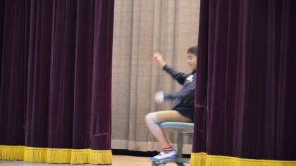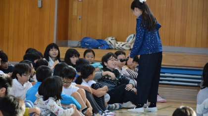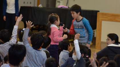 手を上げたこのところに、マイクをもった集会委員の児童が行って正解を聞くと、ほとんどがあたりでした。すごい!最後には集会委員の子がいすに座って通り抜けました。これは簡単。すぐ正解が出ました。