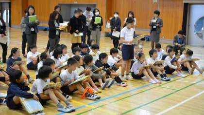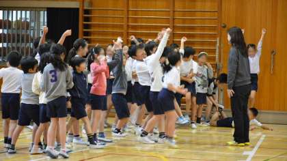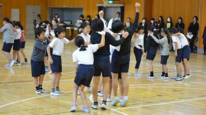ゲームの最後は、担任が弾くピアノに合わせて動き回り、じゃんけんに負けた方が勝ったほうの後につくという「じゃんけん列車」でクールダウン。今日の振り返りを発表して、授業は終了です。互いに励まし合い、協力して活動できるとてもすてきな子どもたちです。集まった各校の教員は、ランチルームで5時頃まで研究協議を行いました。