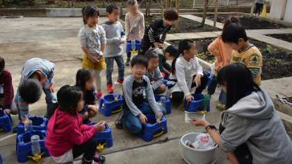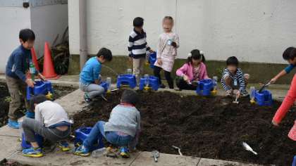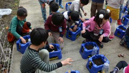 先週、鉢の準備をしていたようすをお伝えしましたが、14日(月)、今日はその鉢に、チューリップを植える作業をしていました。自分の好きな色に花が咲く球根2個を選んで、鉢に土を入れ、ていねいに球根を植えました。春が待ち遠しいですね。