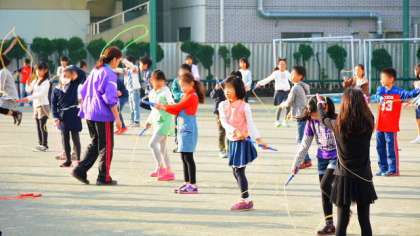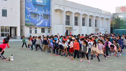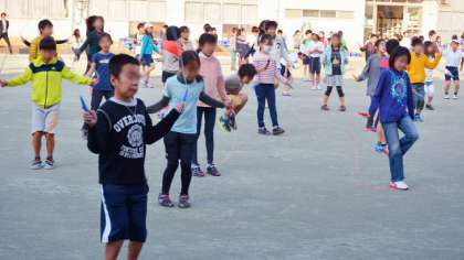 16日(水)、3・4年生が、校庭で体育朝会を行いました。今、各学年が取り組んでいるのは短なわ跳びです。冬場、朝の校庭は日陰が多く寒い朝は凍えるような寒さですが、今年は暖冬のためこの日もそんなに寒くありませんでした。みんな元気に新しい技にチャレンジしていました。