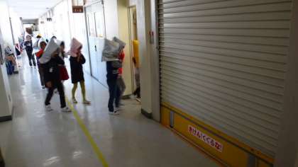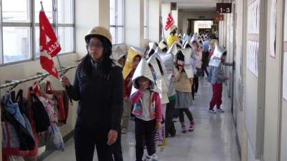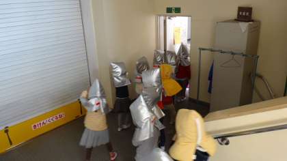 15日(金)、避難訓練を行いました。11時15分、給食室から出火したとの想定で、避難経路上の一部の防火シャッターを閉めての訓練です。シャッターが閉まると、横にある狭い避難口を通らなければなりません。避難の約束を守って、整然と避難できていました。